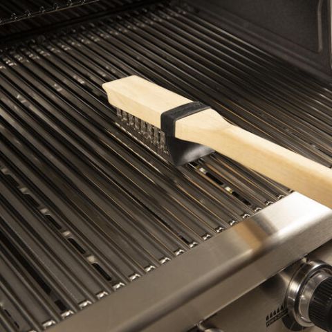 Щітка дерев'яна з металевою щетиною. Матеріал натуральне дерево, нержавіюча сталь. Оснащена великою головкою з подовженими щетинками з нержавіючої сталі. Дерев'яна ручка збільшеного розміру має зручну для захоплення контурну рукоятку. Кінець дерев'яної гриль-щітки призначений для зіскоблювання з метою очищення ливарних сторін. Оснащена запатентованим захисним силіконовим екраном від бруду і бризок Broil King.
