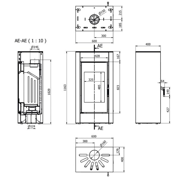 - Діаметр димоходу: 150 мм