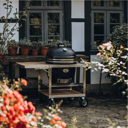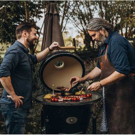 Цей керамічний гриль дуже простий у використанні: на розпалювання піде не більше кількох хвилин. Верхня кришка для регулювання подачі повітря, термометр, отвір для тріски, зольник - все це робить гриль зручним для використання. На бамбуковому столику можна різати та розкладати їжу.