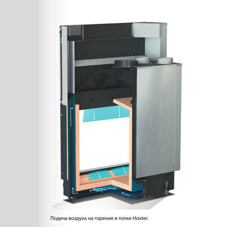 Чистота скла в топках Hoxter досягається за рахунок високої температури та особливої подачі повітря. Подача повітря на горіння відбувається наступним чином: первинна подача – це 20% холодного повітря подається по всьому периметру рамки знизу дверцят для розпалу каміна та на підтримку горіння. Вторинна подача - це 80% вже підігрітого повітря подається по всьому периметру рамки зверху дверцят на скло для обдуву скла та для горіння. Ця подача забезпечує ефект красивого полум’я по всьому периметру топки.